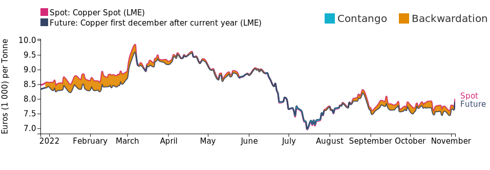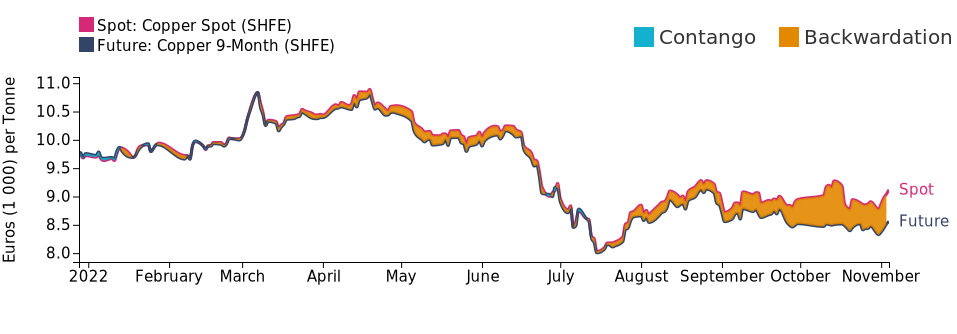 In the absence of the market's expected signs of monetary policy normalization, the spot price of LME copper contracted on 2 and 3 November, while the SHFE rose after Monday's decline on rumours of a possible easing of the country's zero-Covid policy. Also supporting the copper price was the news, released on Thursday, of a blockade at the Peruvian Las Bambas mines.