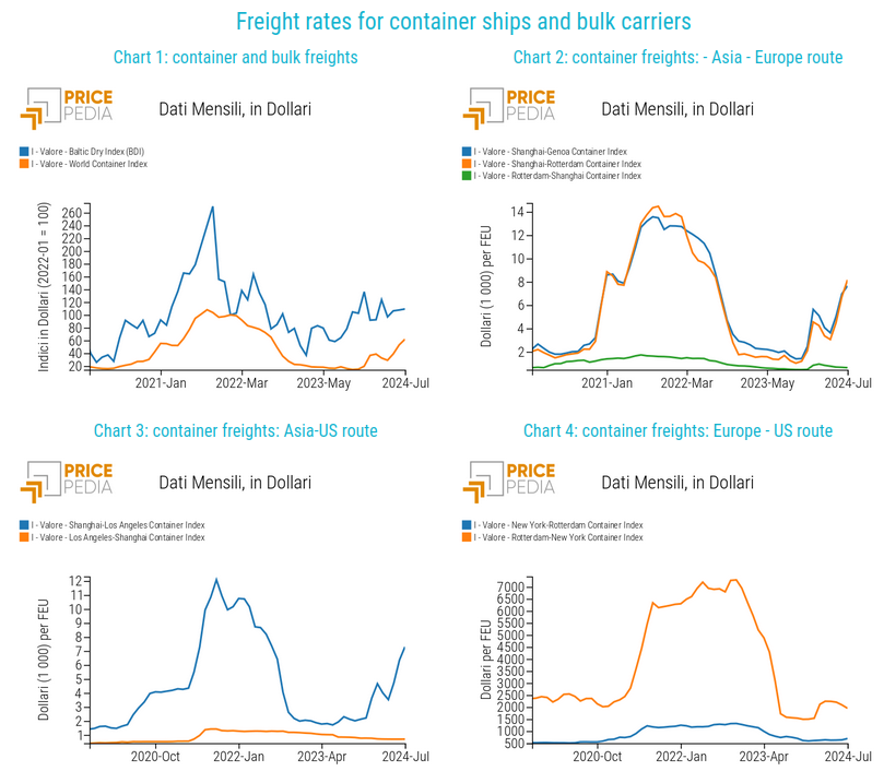 The chart depicts the dynamics recorded by the two indicators in recent years. The cost of freight rates has been characterized by an upward trend since the end of 2020 and reached high levels during 2021. The growth phase was influenced by the recovery of global trade after the end of widespread lockdowns. In the case of container rates, structural factors also played a role.