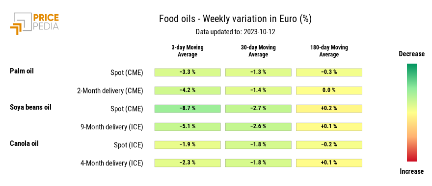 From the reported heatmap, a general reduction in oil prices emerges, particularly for soybean oil, which shows a weekly change of -6%.