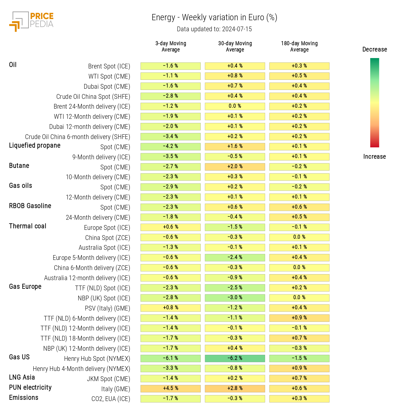 The PricePedia energy prices heatmap is colored green, except for the PUN, which records an increase, although not significant because it depends on the strong intra-week price variability.
