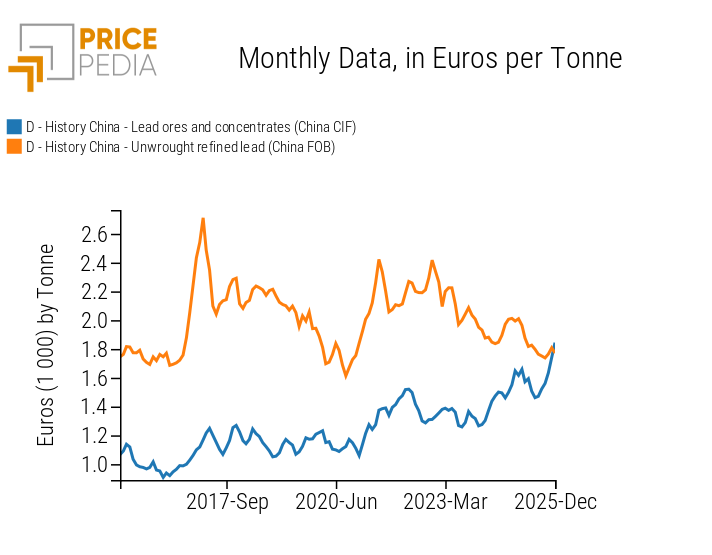 In China a similar, though less marked, dynamic was observed. Between December 2023 and December 2025, CIF prices of lead ores increased by 40%, from 1316 to 1844 euros/tonne, while over the same period the FOB price of refined raw metal declined from 2007 to 1772 euros/tonne, recording a -12% decrease.