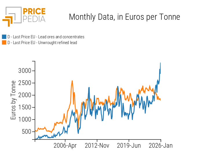 In the European customs market, lead ore prices in January 2026 more than doubled compared to January 2024 levels, rising from 1641 to 3333 euros/tonne. By contrast, over the same period, refined raw lead prices decreased by -20%, falling from 2200 to 1771 euros/tonne.