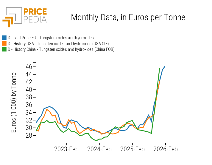 The following charts show the historical customs price trends of tungsten and antimony oxides, expressed in euros per ton.