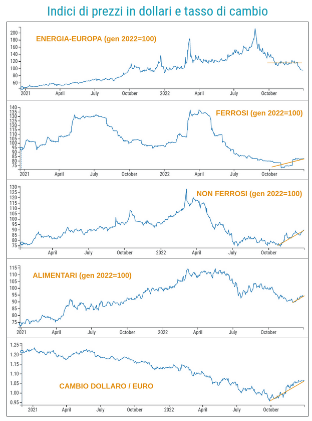 Il grafico che segue riporta il prezzo delle importazioni UE del litio nella forma di carbonato e di ossido e la quotazione spot del cobalto rilevata al London Metal Exchange. I prezzi sono stati riportati in indice in euro per facilitarne l’analisi.