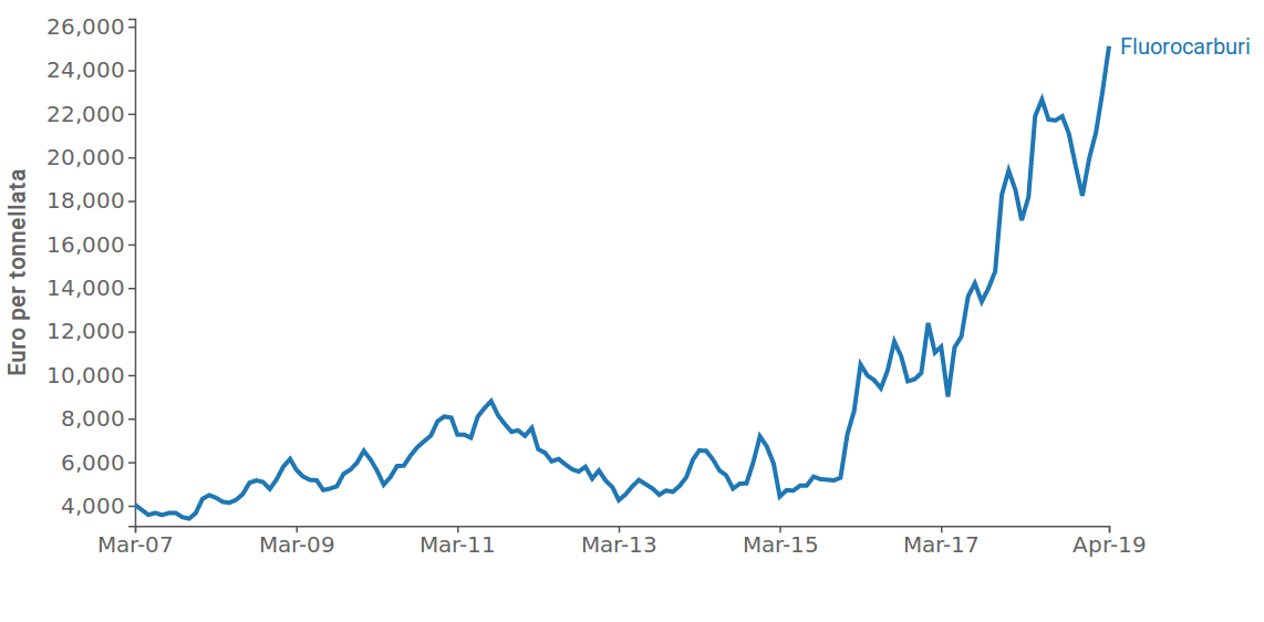 Tra il 2007 e il 2015 il prezzo dei fluorocarburi ha avuto volatilità relativamente contenuta, oscillando tra i 4000 e i 6000 euro per tonnellata. Nonostante ciò, in quest’arco temporale si è realizzato un breve ciclo, con picchi nella seconda metà del 2011 prossimi a 8800 euro, e che si concluso definitivamente nel 2015, con un livello medio di prezzo prossimo ai 5200 euro. Nel 2016 si è originato un trend positivo, ancora in corso, che ha quasi quintuplicato il livello del prezzo, raggiungendo, nei primi mesi del 2019, il suo record storico a quota 25000 euro. Nel corso di questo trend ci sono state delle flessioni, alcune anche recenti, come quella che ha caratterizzato la seconda metà del 2018, in cui il prezzo da 21800 euro è passato a circa 18200 (-16,5%) per poi recuperare fino al suo massimo storico.