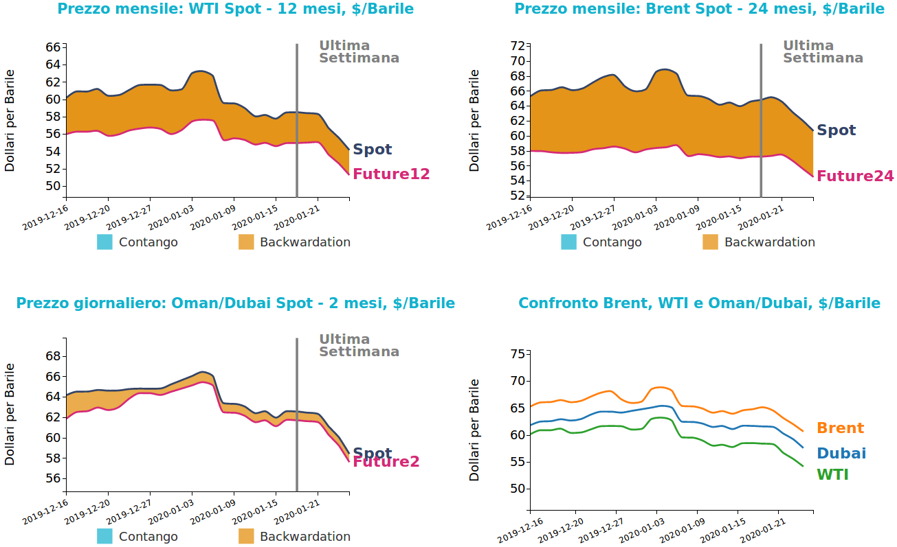 Energetici Analisi settimanale PetrolioLa settimana scorsa il prezzo del petrolio perde l’ampio margine registrato durante le tensioni USA-Iran, sfiora i bassi livelli dell’inizio dello scorso anno, chiudendo in forte ribasso. Perdendo circa 4 dollari: il Brent chiude a 60.7 dollari al barile, il WTI a 54.2, l’Oman/Dubai a 57.6. A determinare questa dinamica sono i timori legati al corona virus, ovvero che l’epidemia potrebbe causare una frenata dell’economia globale e quindi della domanda di materie prime.