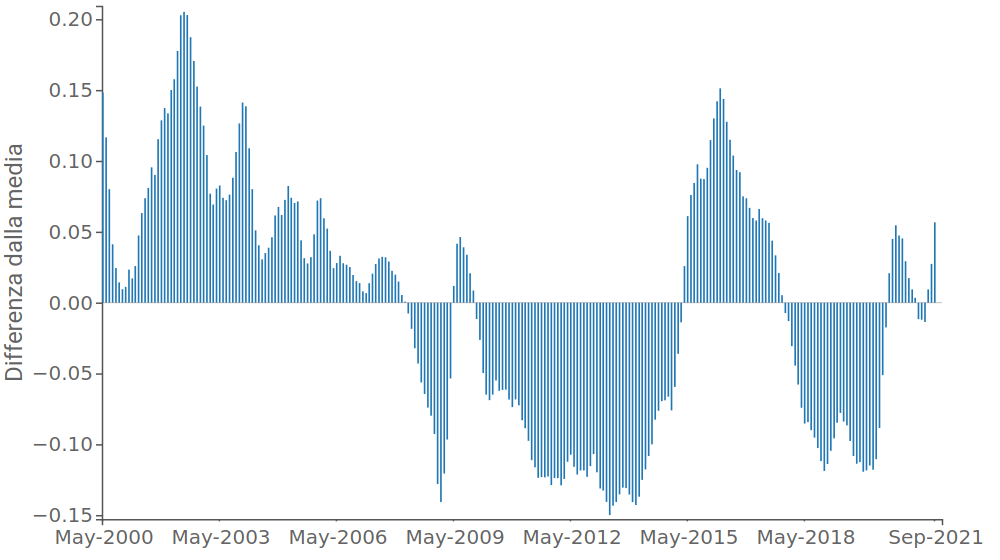 Dal grafico che segue è possibile, inoltre, osservare la dinamica della marginalità della produzione di etilene. L’indice di mark-up illustrato è stato costruito come differenza dalla media di lungo periodo del rapporto tra il prezzo dell’etilene e il suo should cost.