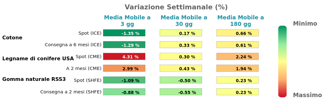 Concludiamo questa rassegna segnalando la forte divergenza che ha contraddistinto le ultime tre sedute settimanali del complesso delle Piantagioni. Mentre Gomma e Cotone, perdono terrono, il Legname di conifere spot guadagna sul mercato nord americano ben il +4.3% (+3% per il corrispondente future). Di particolare interesse è constatare il cambio di rotta del Cotone, che nel medio periodo segna incrementi superiori al +0.2%.