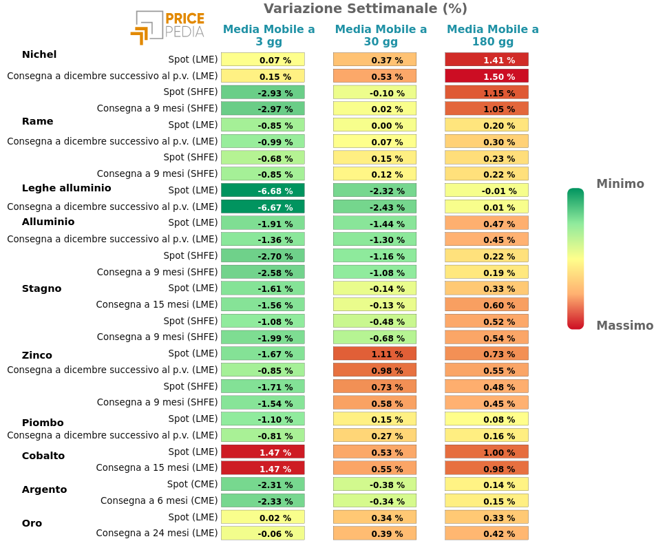 In netta controtendenza la variazione settimanale delle quotazioni del Cobalto, che sulla media a tre giorni segnano rialzi dell’ 1.4%.