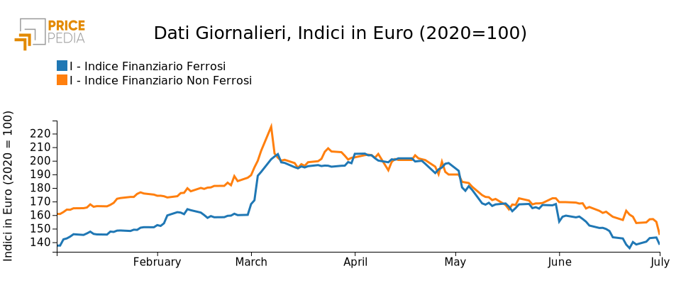 Il grafico che segue riporta gli indici finanziari PricePedia per i metalli ferrosi e non ferrosi.
