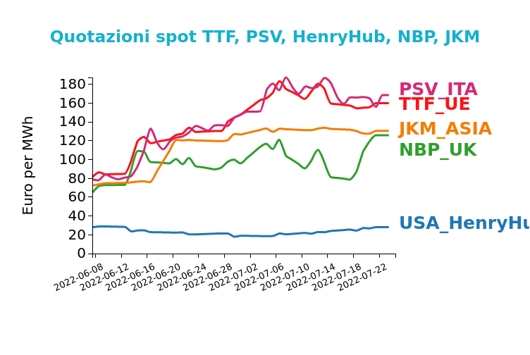 1. Il prezzo del gas naturale nei diversi mercati finanziari fa riferimento al prezzo registrato venerdì 22 luglio 2022. Il valore in parentesi indica la differenza con il venerdì precedente.