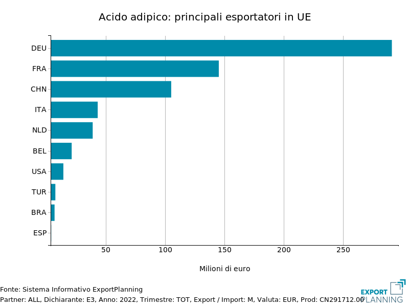 Il mercato UE è presidiato dall'industria europea, anche se la Cina, praticamente assente prima della Grande Recessione, è cresciuta significativamente negli ultimi anni, fino ad esportare oltre 10 mila tonnellate al trimestre (grafico in basso a sinistra). Nei primi 9 mesi del 2022 la Cina ha esportato 30 milioni di euro di acido formico in Europa, raggiungendo la seconda posizione tra i principali esportatori (grafico in alto a destra).