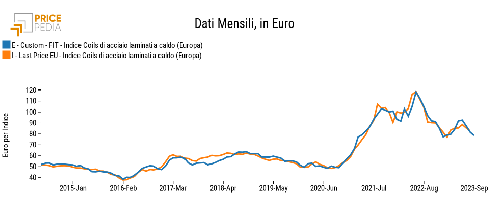 Come variabile endogena è stato utilizzato l'Indice Coils di acciaio laminati a caldo (Europa), pubblicato nella sezione Last Price EU > Indici aggregati Europa della piattaforma PricePedia. Questo indice è dato dalla media pesata dei prezzi dei coils, decapati e non, di diversi spessori, oggetto di scambi commerciali, in import e export, dei 27 paesi UE. I prezzi di questi prodotti sono fortemente correlati (con una correlazione sempre superiore o uguale a 0.93), segnalando l'esistenza di molte determinanti in comune. Solo il "decapaggio" risulta una determinante specifica, corrispondente ad un sovraprezzo costante prossimo a 55 euro per tonnellata, che grava sui coils che hanno subito questa lavorazione.