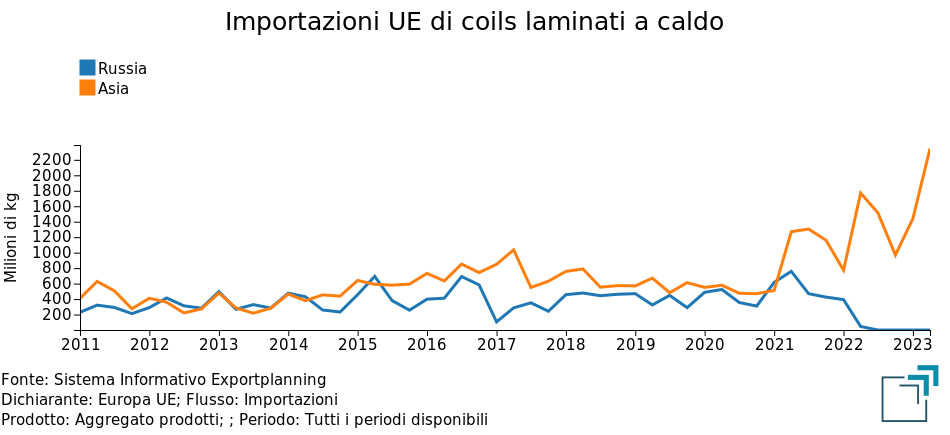 Il divieto introdotto il 15 marzo 2022 di importazioni UE di coils laminati a caldo dalla Russia ha avviato un processo di sostituzione di importazioni dalla Russia con importazioni di coils dai paesi asiatici (India, Giappone, Corea del Sud, Taiwan, Indonesia). Lo squilibrio di offerta sul mercato UE e i maggior costi di trasporto delle importazioni asiatiche hanno determinato, ceteris paribus, un livello maggiorato del 13% dei prezzi dei coils scambiati sul mercato UE.