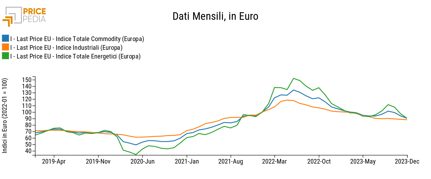 Dopo l'anomala crescita che ha interessato i prezzi nel biennio 2021-2022, nel 2023 si è registrata una riduzione generalizzata delle quotazioni in euro sul mercato europeo. La dinamica discendente è stata più accentuata nel corso della prima parte dell'anno. Nella seconda parte, invece, si è assistito a nuovi aumenti dei prezzi degli Energetici, legati soprattutto alle politiche di riduzione dell'offerta di petrolio da parte dell'OPEC+ e al conseguente effetto lungo tutta la relativa filiera; i prezzi delle commodity industriali "core" sono stati invece interessati da una sostanziale stabilità, segnale che essi hanno raggiunto un pavimento al di sotto del quale è difficile scendere (si veda l'articolo Quinto mese di stabilità dei prezzi fisici delle commodity industriali).