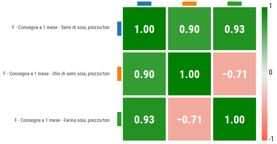 Nella due tabelle che seguono, sono riportate le correlazioni parziali dei prezzi dei prodotti quotati alla borsa cinese Dailan Commodity Exchange (DCE) [1] e dei prezzi fisici rilevati alle dogane UE.