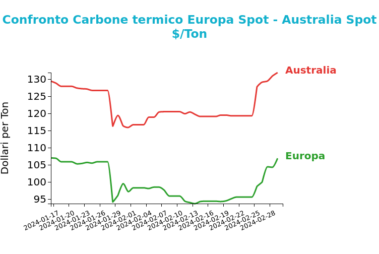 La scorsa settimana, il prezzo dei futures FOB Newcastle per il carbone 6000 kcal/kg NAR ha registrato un aumento del 10.6%, raggiungendo i 132 $/tonnellata venerdì. Contrariamente, il prezzo dei futures con consegna al mese successivo per il carbone indonesiano 4200 kcal/kg GAR FOB Kalimantan è sceso del 2%, chiudendo a 56 $/tonnellata venerdì. In Cina, il prezzo spot FOB Qinhuangdao per il carbone 5500 kcal/kg NAR è sceso del 2.1% rispetto alla settimana precedente, mentre le scorte totali di carbone nei porti settentrionali erano di 15.1 milioni di tonnellate, in aumento del 13% rispetto a metà febbraio.