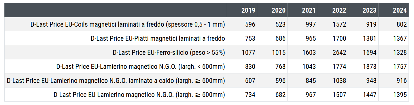 Nella tabella che segue sono riportati i prezzi dell'acciaio magnetico non legato e del lamierino magnetico al silicio NGO. I prezzi del 2024 sono relativi alla media dei primi tre mesi dell'anno.
