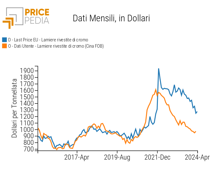 Nei grafici che seguono il prezzo delle esportazioni cinese è messo a confronto con il prezzo doganale UE. I prezzi riguardano la vergella e le lamiere rivestite di cromo.