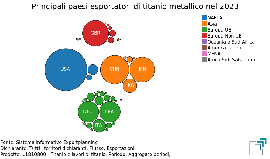 Nel caso del titanio metallico, invece, l'offerta sui mercati internazionali è molto meno concentrata. In questo caso, il primo esportatore sono gli Stati Uniti, seguiti da vicino da Cina, Giappone e Regno Unito. Anche l'UE, guidata da Germania e Francia, ha un ruolo di rilievo.
