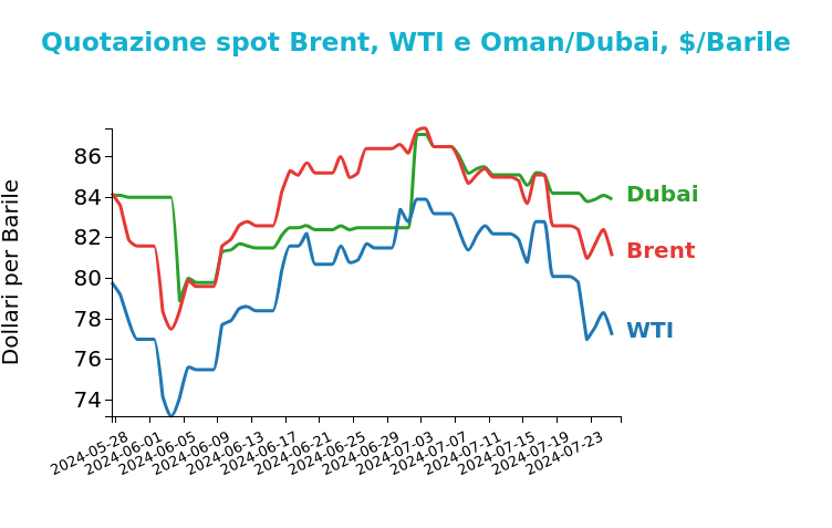 La scorsa settimana ha visto i prezzi del greggio scendere per la seconda sessione consecutiva, toccando i minimi mensili. Il WTI ha chiuso a 77.2 $/bbl, in calo di -2.9 $/bbl rispetto a venerdì 19 luglio, mentre il Brent è sceso a 81.1 $/bbl, in calo di -1.5 $/bbl.