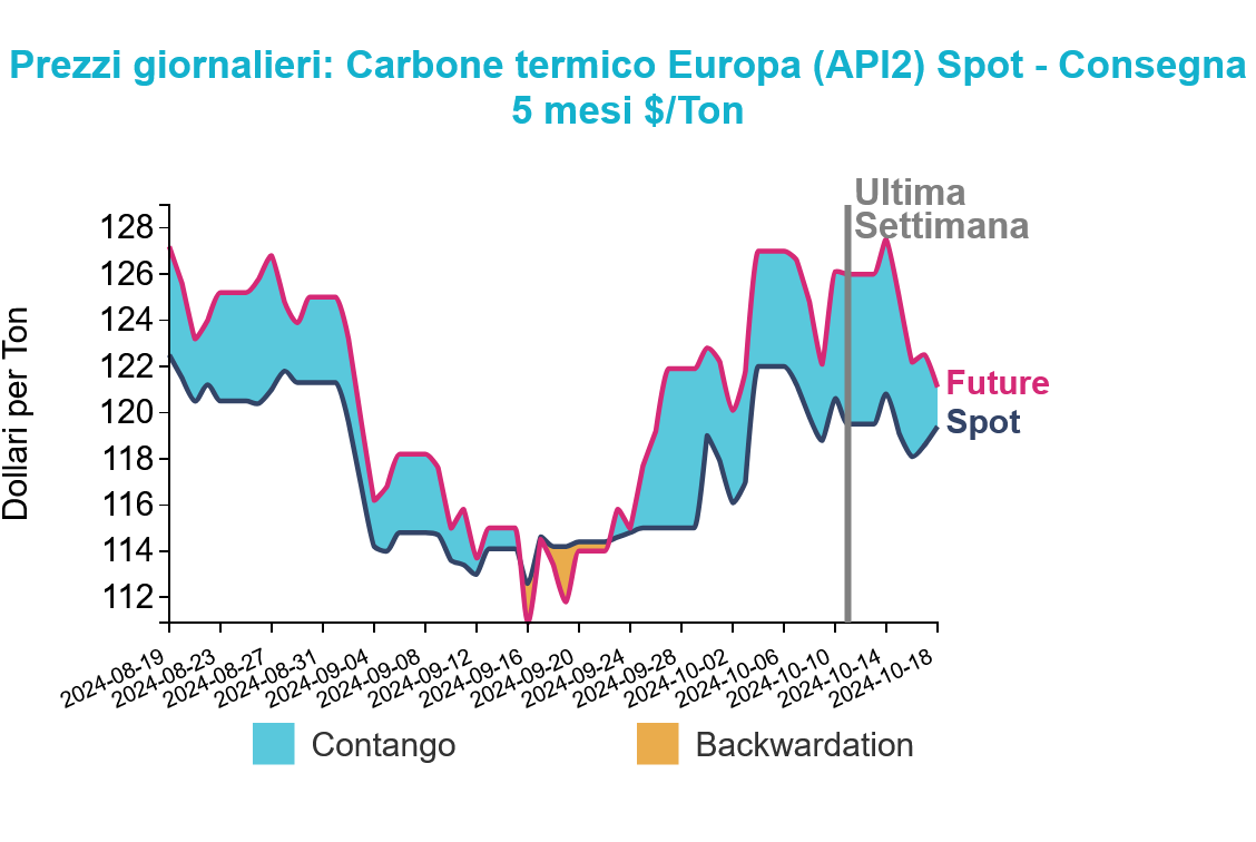 Venerdì 18 ottobre, il contratto Front Month API2 ha chiuso a 119.4 $/ton, sostanzialmente stabile rispetto alla settimana precedente, mentre il contratto Front Month relativo al carbone termico FOB Newcastle ha registrato una diminuzione di -1.3 $/ton, chiudendo a 145.4 $/ton.
