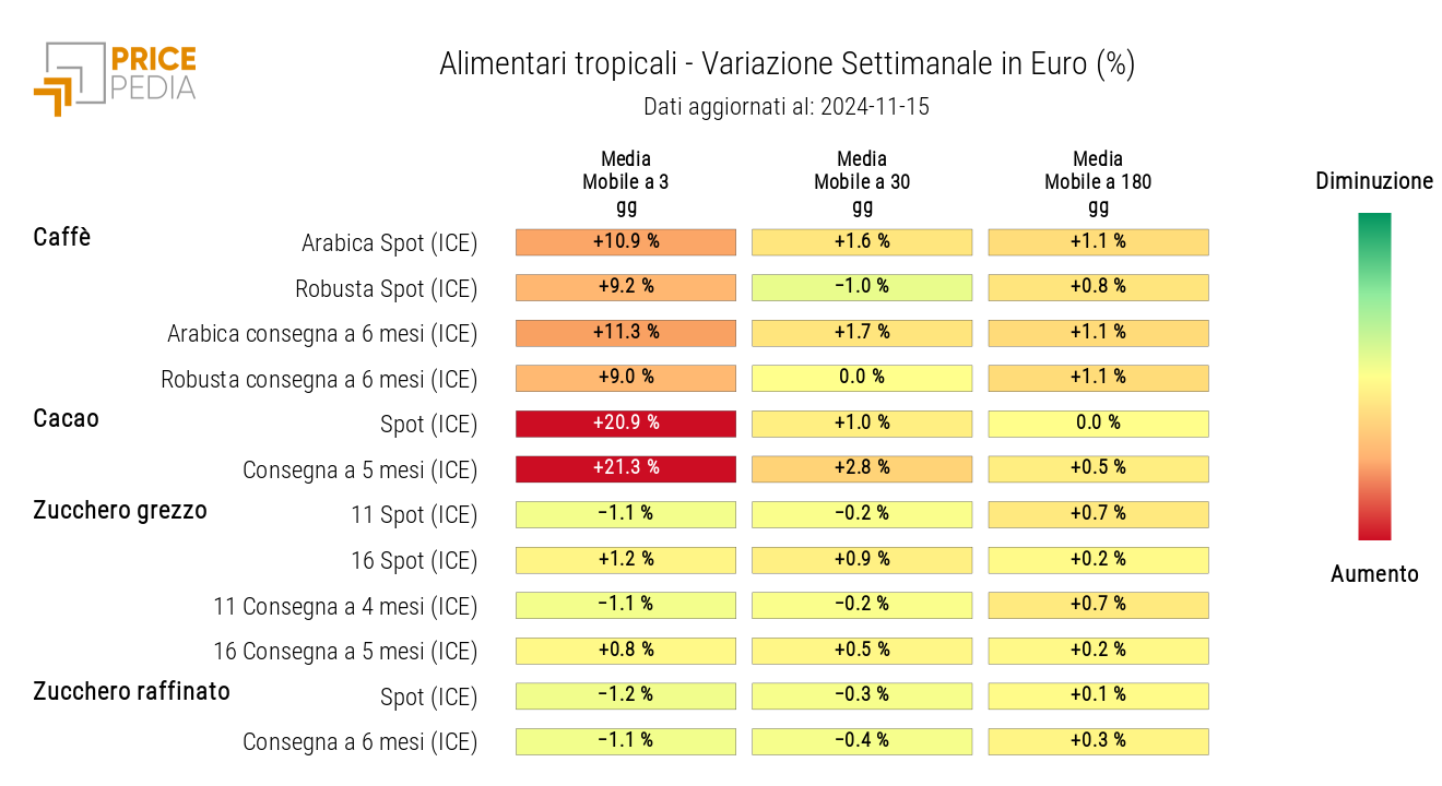 La heatmap dei tropicali segnala un'importante crescita settimanale dei prezzi del cacao e del caffè.