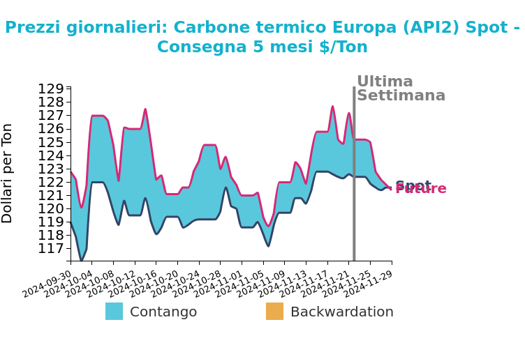 La scorsa settimana, il prezzo dei futures API2 per dicembre è calato dello 0.2%, chiudendo a 121.9 $/ton. A novembre, il prezzo è cresciuto del 3.1%, grazie all'aumento stagionale della domanda di carbone in Germania (+32.4% rispetto a ottobre) e al rialzo dei prezzi del gas TTF (+22.1%). Da inizio anno, il contratto è salito del 14.9%, trainato dai prezzi del gas naturale e influenzati dagli eventi geopolitici.