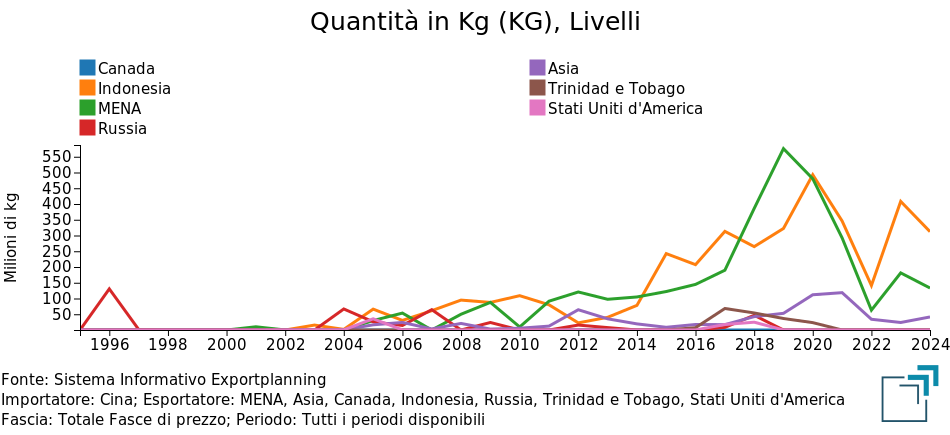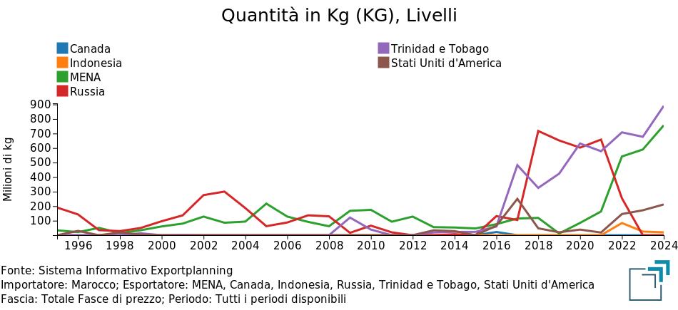 Tra i maggiori esportatori di ammoniaca troviamo i paesi del Medio Oriente e Nord Africa (MENA), Trinidad e Tobago, Indonesia, Canada, Stati Uniti e Russia. Il grafico che segue riporta la dinamica delle esportazioni in quantità di questi paesi negli ultimi 30 anni.