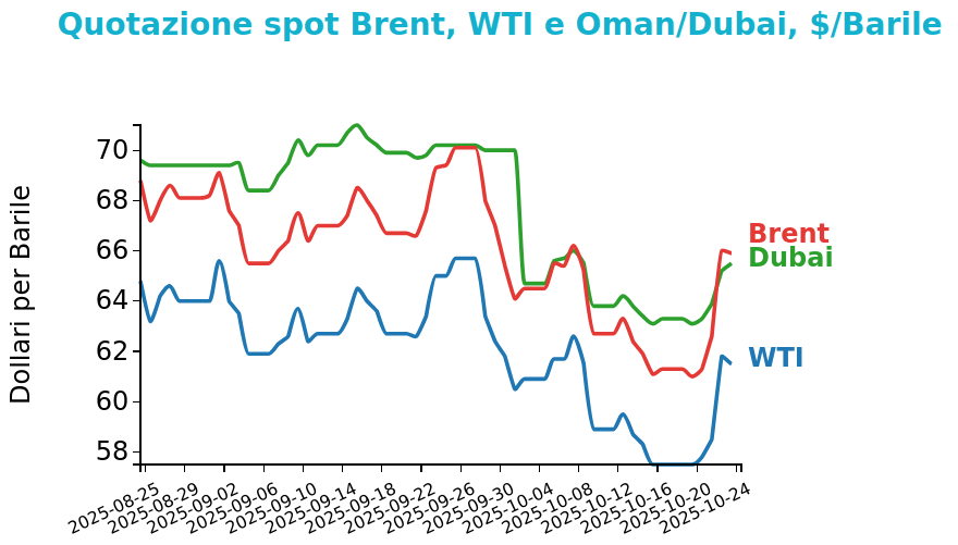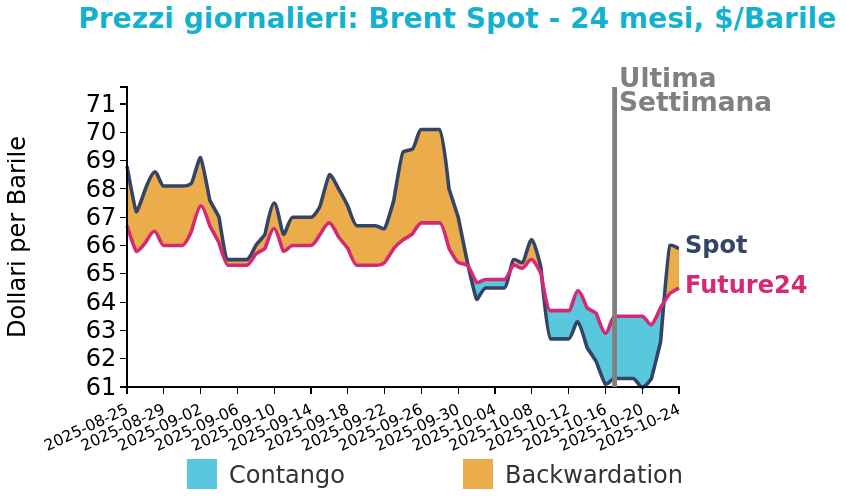 I prezzi del Brent hanno chiuso a 65.9 $/bbl venerdì 24 ottobre, in aumento di -7.5% $/bbl rispetto alla chiusura della settimana precedente. Anche il WTI ha segnato una crescita significativa, salendo di 4.0 $/bbl e chiudendo le quotazioni a 61.5 $/bbl.