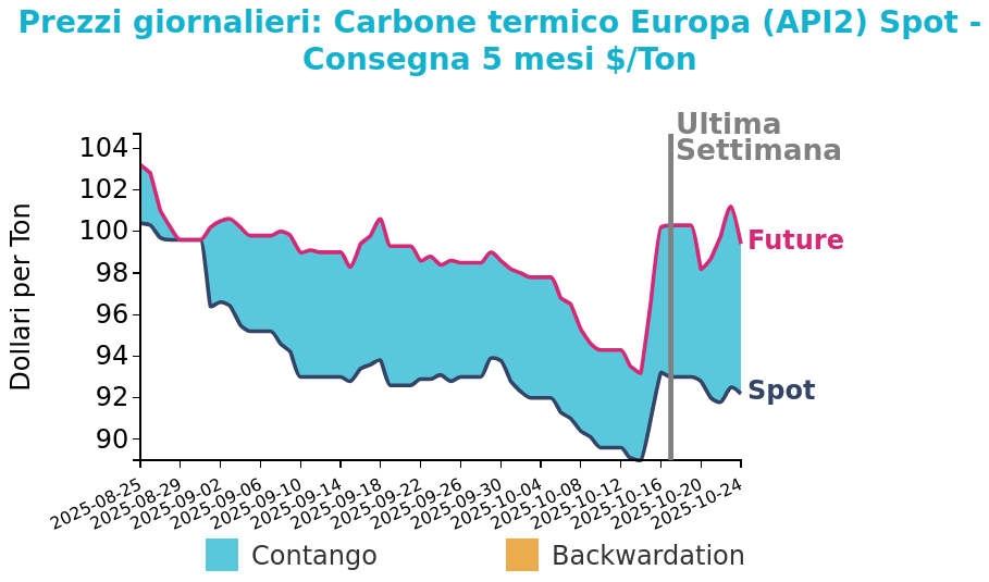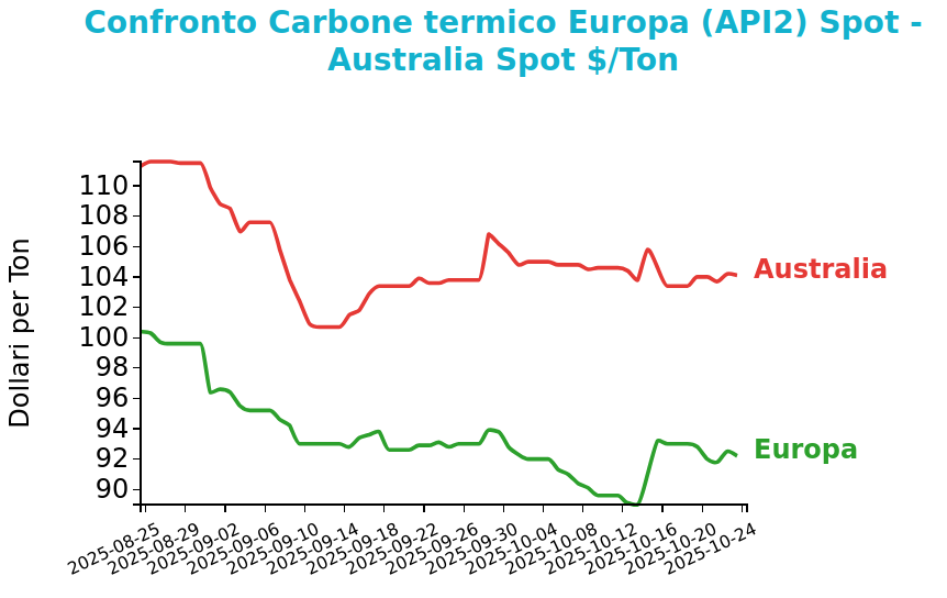 Venerdì 24 ottobre il prezzo del carbone termico Europa API2 ha chiuso a 92.2 $/ton, in calo di -0.8 $/ton rispetto al venerdì della settimana precedente. I futures sul carbone termico australiano hanno invece registrato un aumento, pari a 0.7 $/ton, attestandosi a 104.1 $/ton.