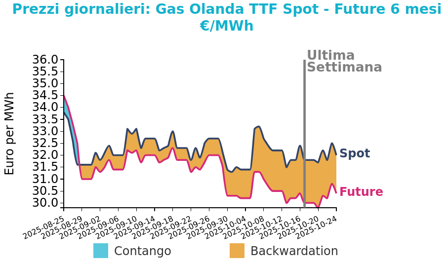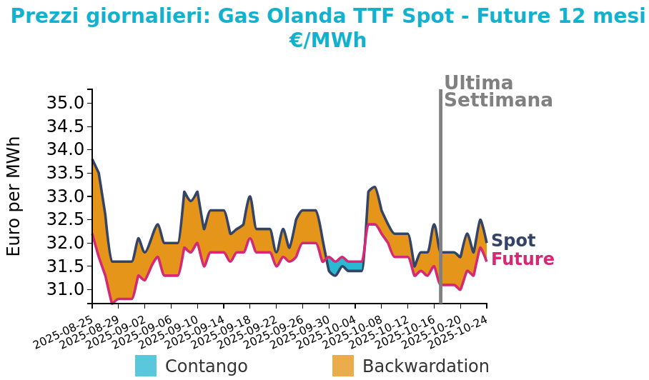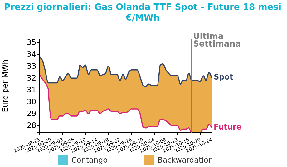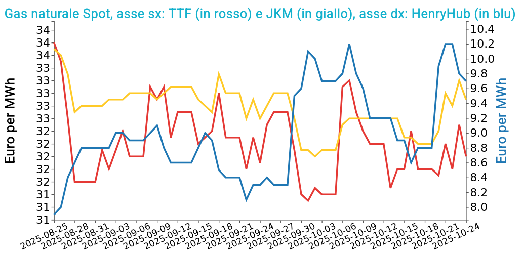 All’inizio di questa settimana, il TTF è sceso dell’1.7% a 32.28 €/MWh, in un contesto ancora caratterizzato da oscillazioni limitate.