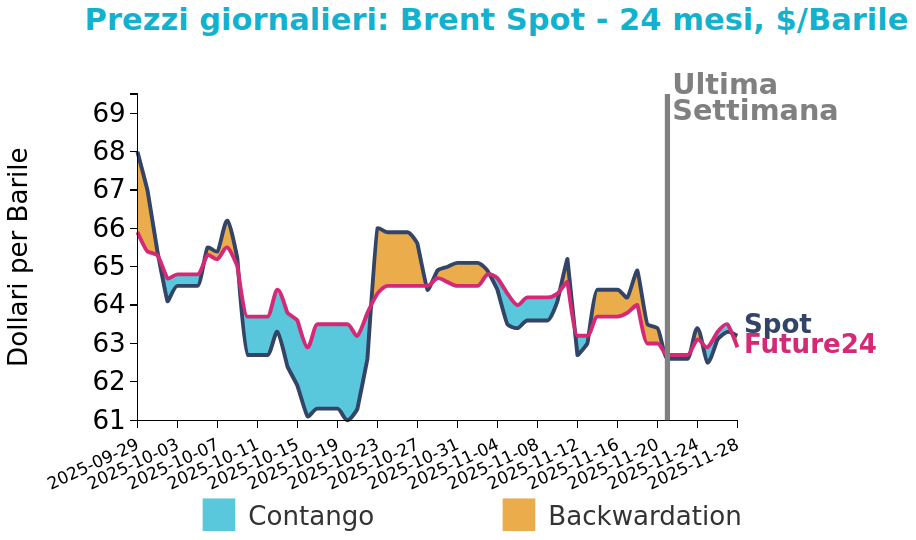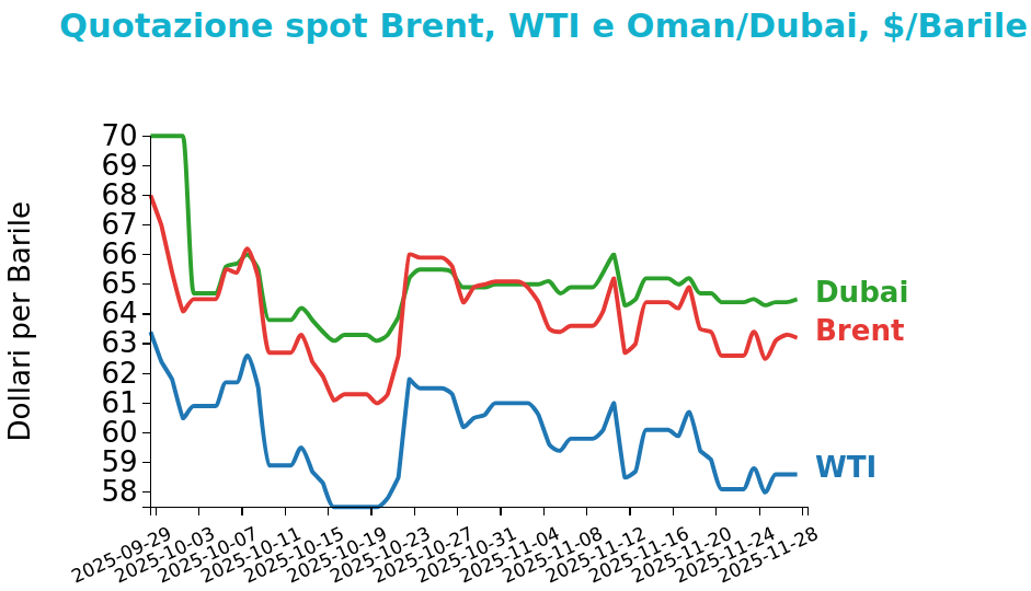 I prezzi del Brent hanno chiuso a 63.2 $/bbl venerdì 28 novembre, in aumento di 0.6 $/bbl rispetto alla chiusura della settimana precedente. Anche il WTI è rimasto relativamente stabile, registrando una variazione di 0.5 $/bbl e chiudendo le quotazioni a 58.6 $/bbl.
