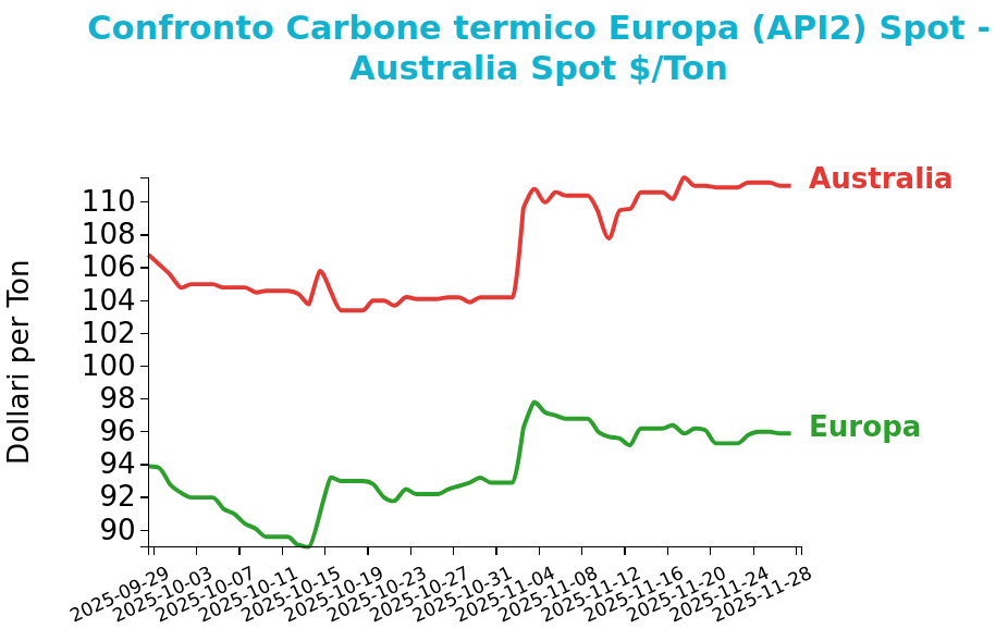 Venerdì 28 novembre il prezzo del carbone termico Europa API2 ha chiuso a 95.9 $/ton, in crescita di 0.6 $/ton rispetto al venerdì della settimana precedente. I futures sul carbone termico australiano dono rimasti maggiormente stabili, con una variazione di 0.1 $/ton, attestandosi a 111 $/ton.