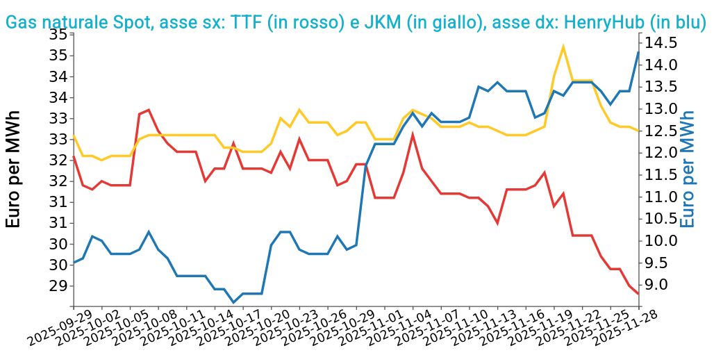 Il contratto TTF FM ha registrato un marcato calo settimanale, in un contesto caratterizzato da domanda debole e disponibilità di offerta equilibrata. L’andamento ribassista si è consolidato a partire dal 18 novembre, sostenuto da previsioni meteo più miti e da prospettive di ampi flussi LNG e norvegesi. In Germania la riattivazione della FSRU di Brunsbüttel ha aumentato i volumi in ingresso, mentre l’impianto di Wilhelmshaven 2 è rimasto fermo limitando i flussi complessivi. In Francia, le interruzioni nei terminali di Fos Tonkin e Montoir hanno proseguito a influire sulle movimentazioni.