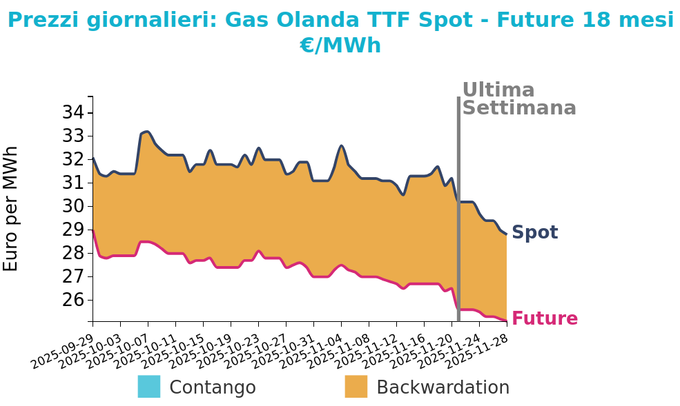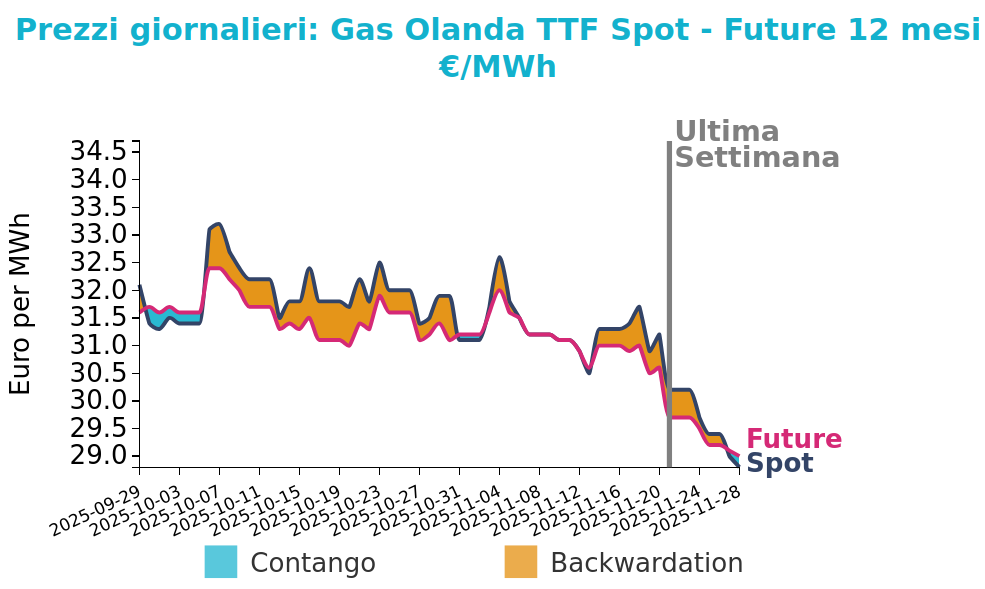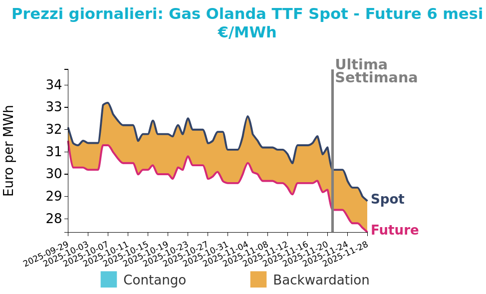 - TTF Olanda 30.2 €/MWh (-1.1 €/MWh)