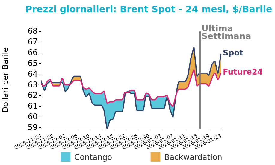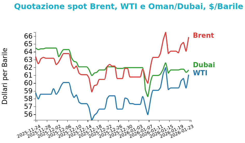 I prezzi del Brent hanno chiuso a 65.9 $/bbl venerdì 23 gennaio, in aumento di 1.8 $/bbl rispetto alla chiusura della settimana precedente. Le quotazioni del WTI hanno anch’esse registrato una crescita, con una variazione di 1.7 $/bbl e chiudendo a 61.1 $/bbl.