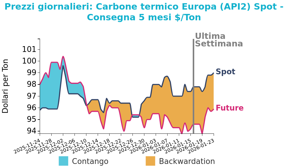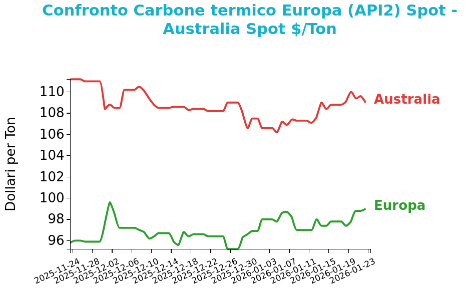 Venerdì 23 gennaio il prezzo del carbone termico Europa API2 ha chiuso a 99.0 $/ton, in crescita di 1.2 $/ton rispetto al venerdì della settimana precedente. I futures sul carbone termico australiano sono invece rimasti stabili, con una variazione di 0.2 $/ton, attestandosi a 109.0 $/ton.