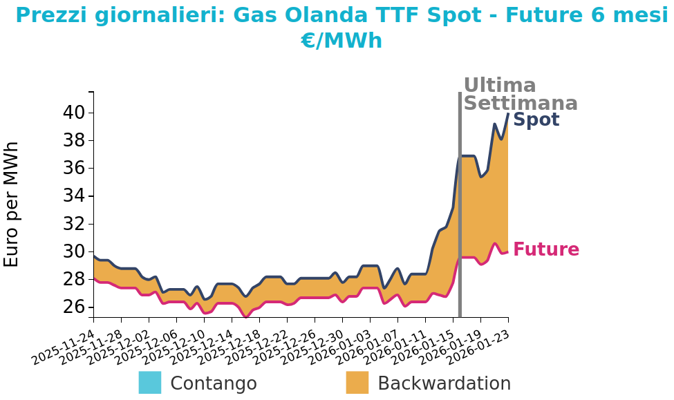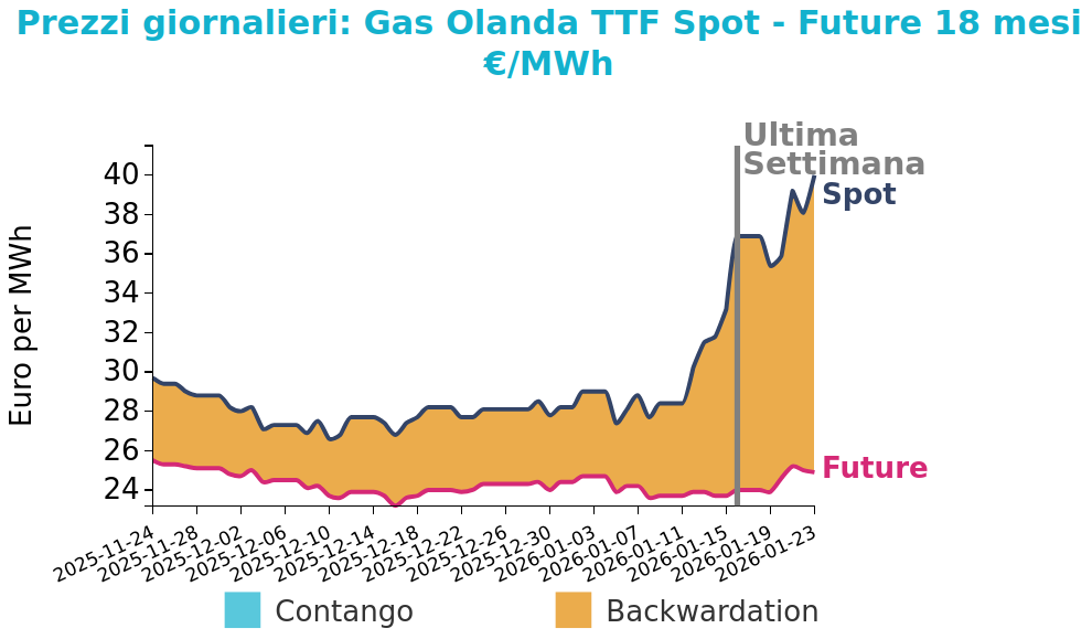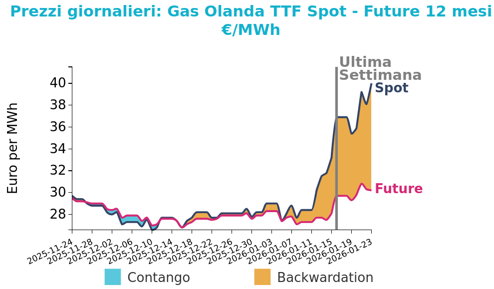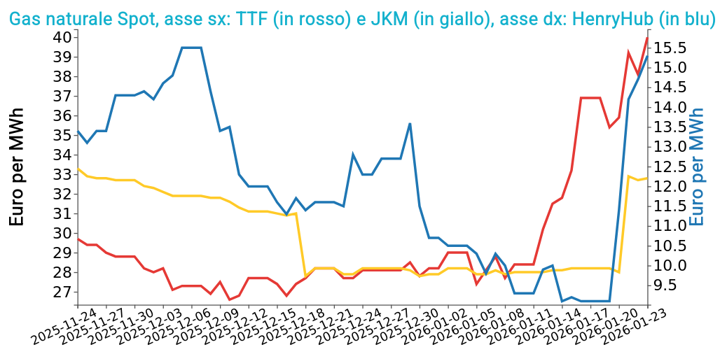 Il mercato europeo del gas naturale attraversa una fase di spiccata tensione rialzista, con il benchmark TTF che ha superato la soglia dei 40 €/MWh per la prima volta dallo scorso giugno. Questo incremento è alimentato da una convergenza di fattori climatici e logistici: l'ondata di gelo eccezionale che ha colpito gli Stati Uniti ha infatti causato fenomeni di "freeze-off", riducendo drasticamente la produzione interna e limitando i flussi di alimentazione verso i terminali di esportazione di GNL, in particolare a Sabine Pass e Corpus Christi.
