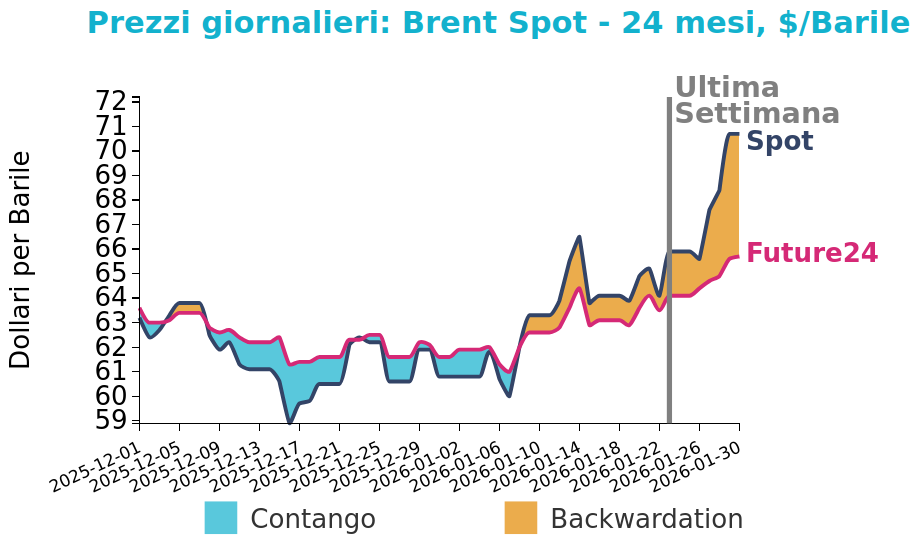 La scorsa settimana i prezzi hanno mostrato un andamento positivo, con il Brent che ha chiuso a 70.7 $/bbl venerdì 30 gennaio, in aumento di 4.8 $/bbl rispetto alla chiusura della settimana precedente. Le quotazioni del WTI hanno anch’esse registrato una crescita significativa, con una variazione di 4.1 $/bbl e chiudendo a 65.2 $/bbl.
