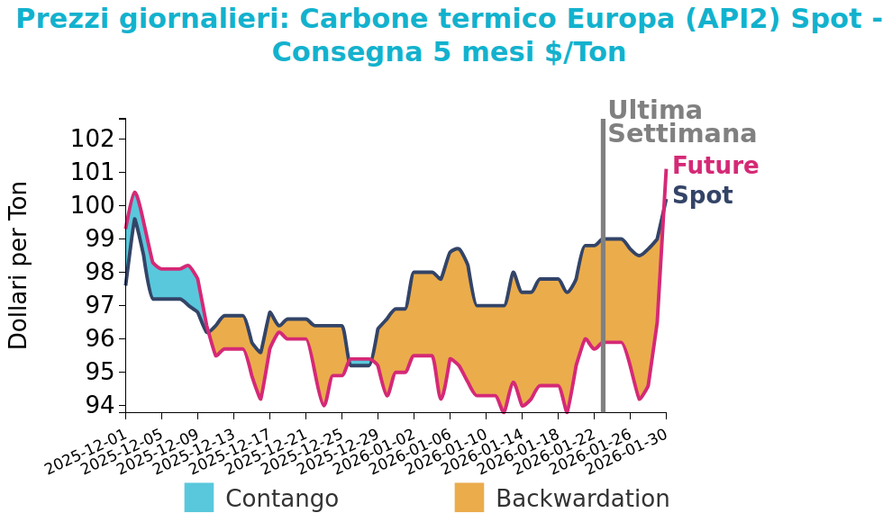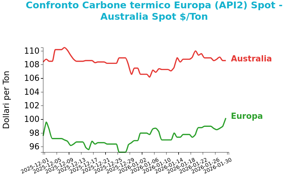 Venerdì 30 gennaio il prezzo del carbone termico Europa API2 ha chiuso a 100.2 $/ton, in crescita di 1.2 $/ton rispetto al venerdì della settimana precedente. I futures sul carbone termico australiano sono invece rimasti maggiormente stabili, con una variazione di -0.4 $/ton, attestandosi a 108.6 $/ton.