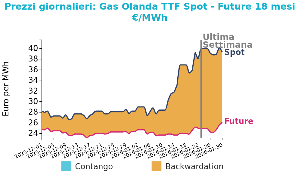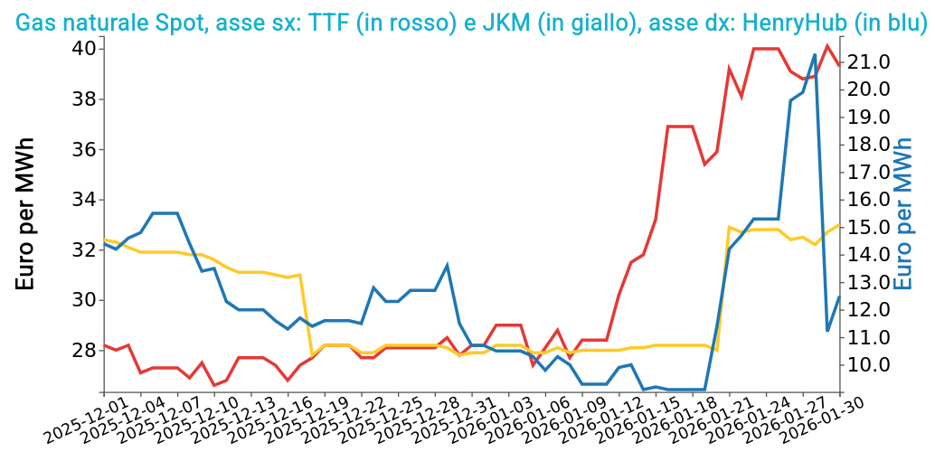 Il rialzo dei prezzi è prevalentemente attribuibile alle interruzioni legate al meteo negli Stati Uniti e dall’aumento del premio di rischio in Medio Oriente. A fine settimana, però, i prezzi si sono stabilizzati, frenati anche dal rafforzamento del dollaro successivo alla nomina di Kevin Warsh alla guida della banca centrale statunitense. Il quadro resta fortemente condizionato dall’evoluzione geopolitica e dalla velocità di recupero dell’offerta globale.