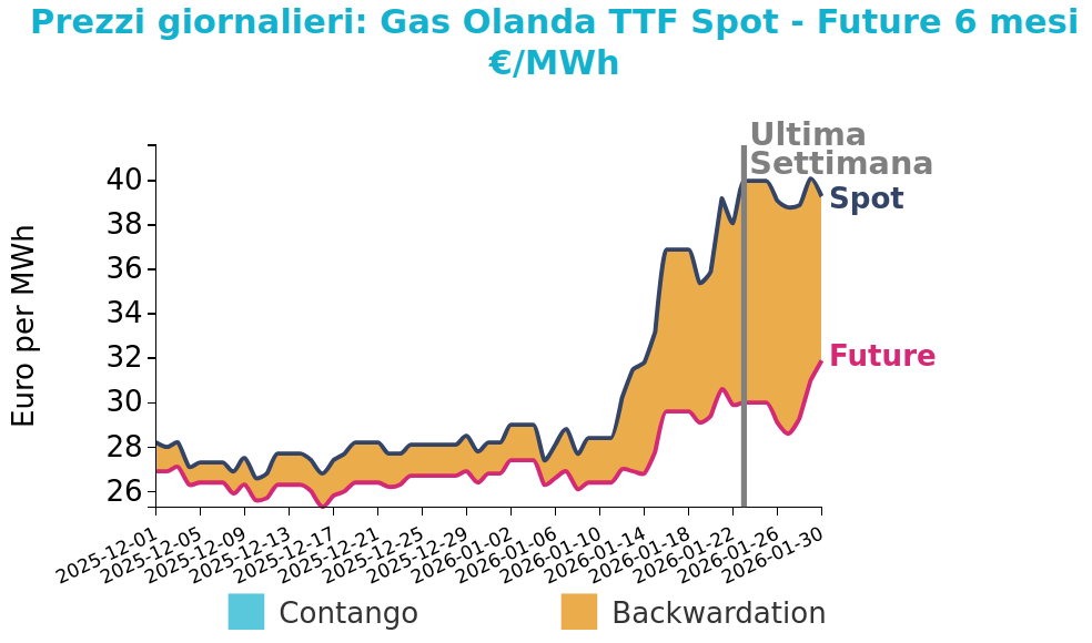 Alla riapertura di lunedì 2 febbraio, il contratto marzo 2026 arretra di circa il 13% intorno a 34 €/MWh, favorito da aggiornamenti meteo più caldi e dal raffreddamento delle tensioni. Sul lato dell’offerta pesano flussi norvegesi solidi e buona disponibilità di GNL. La curva si è appiattita, con il differenziale tra estate 2026 e inverno 2026 in forte riduzione verso la parità.