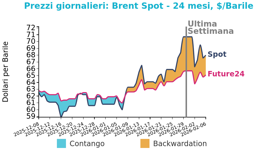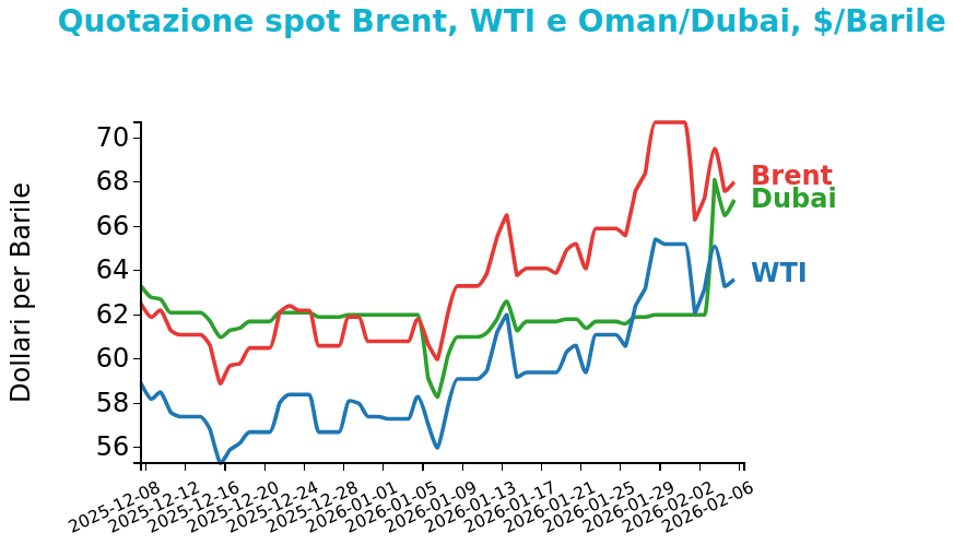 La scorsa settimana il mercato petrolifero è stato caratterizzato da forti oscillazioni legate ai titoli geopolitici e al confronto tra rischi politici e fondamentali di abbondante offerta. I prezzi sono inizialmente scesi in modo marcato a seguito di segnali di distensione tra Stati Uniti e Iran, di un rafforzamento del dollaro e di condizioni meteo più miti negli Stati Uniti, fattori che hanno inciso sulle aspettative di domanda. Il movimento si è poi invertito con il riemergere di tensioni nel Golfo, episodi di sicurezza marittima e dati statunitensi che hanno mostrato un calo delle scorte di greggio, riportando supporto alle quotazioni.
