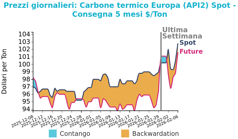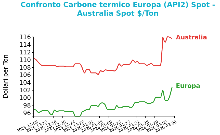 Venerdì 6 febbraio il prezzo del carbone termico Europa API2 ha chiuso a 102.8 $/ton, in crescita di 2.6 $/ton rispetto al venerdì della settimana precedente. I futures sul carbone termico australiano hanno registrato un aumento ancora più marcato, con una variazione di 7 $/ton, arrivando a 115.6 $/ton.