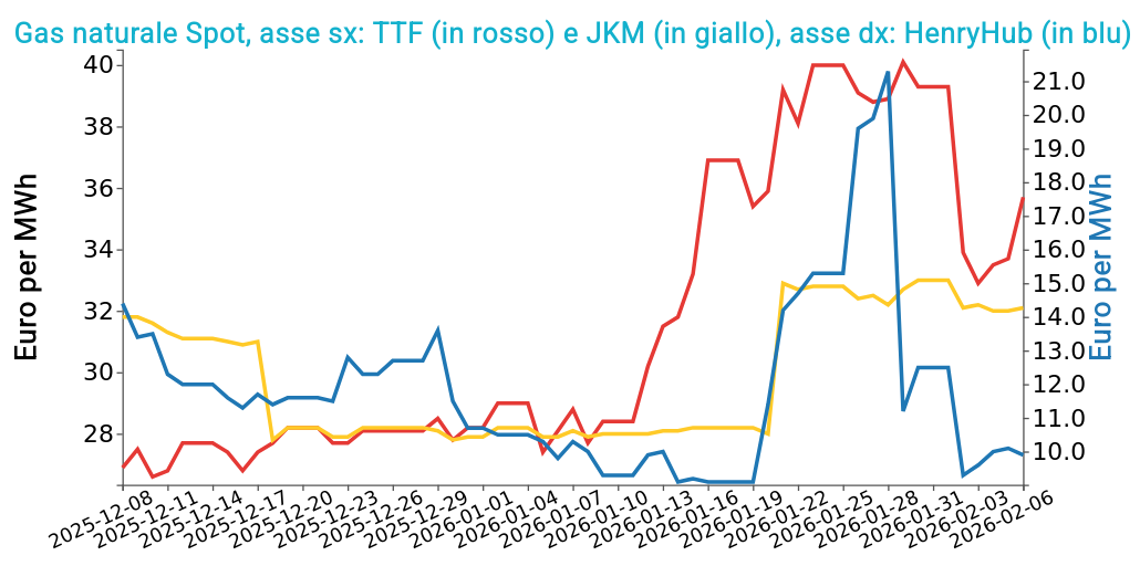 In Asia i prezzi spot del GNL sono scesi su livelli minimi recenti grazie al pieno ripristino dell’offerta statunitense e a un interesse all’acquisto limitato, influenzato da previsioni meteo più favorevoli e dall’avvicinarsi delle festività del Capodanno lunare, che comportano un rallentamento dell’attività industriale in Cina. Sul fronte dell’offerta globale, le esportazioni di GNL restano robuste grazie alla ripresa di alcuni impianti africani e nordafricani e all’avanzamento di nuovi progetti, nonostante ritardi puntuali in Australia.