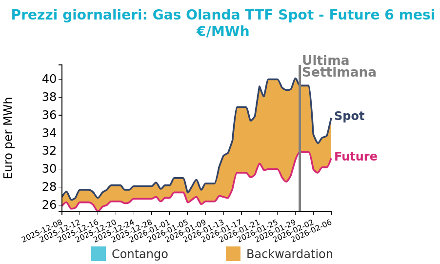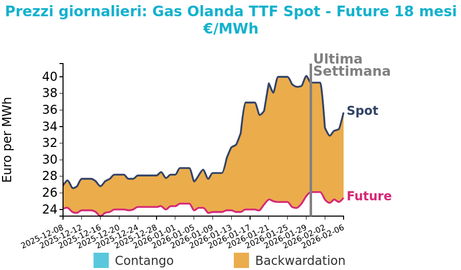 Il mercato del gas europeo ha registrato un forte ridimensionamento dei prezzi dopo i rialzi della settimana precedente, sostenuti da fattori temporanei legati al contesto statunitense. Il cambio di sentiment è stato rapido e ha portato a una fase di vendite, favorita dal recupero dei flussi di gas verso gli impianti di liquefazione negli Stati Uniti, da revisioni meteo verso condizioni più miti e da un allentamento delle tensioni geopolitiche internazionali. Anche le prospettive climatiche sull’intero emisfero settentrionale hanno contribuito a ridurre le attese di domanda, in particolare per il GNL asiatico.